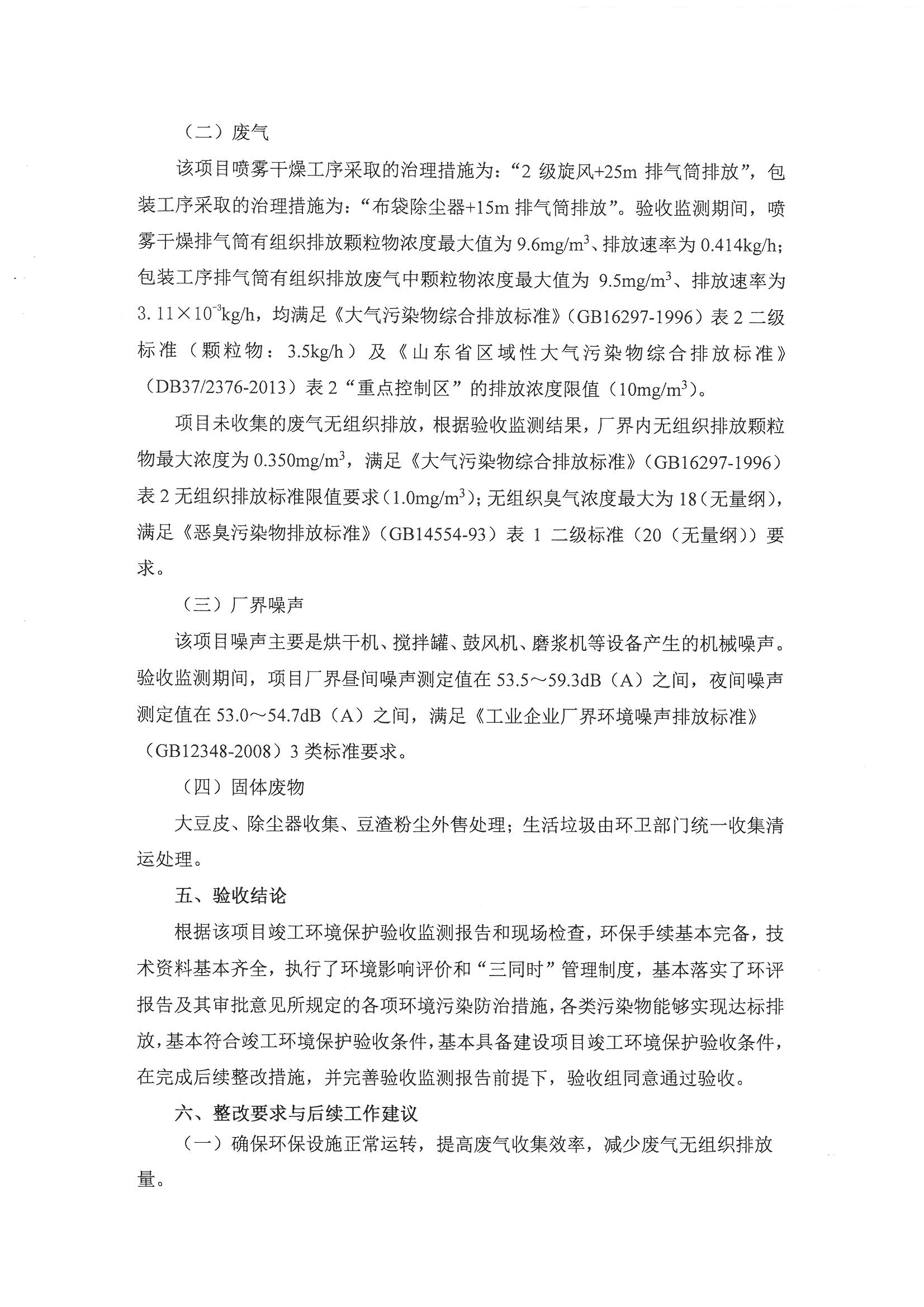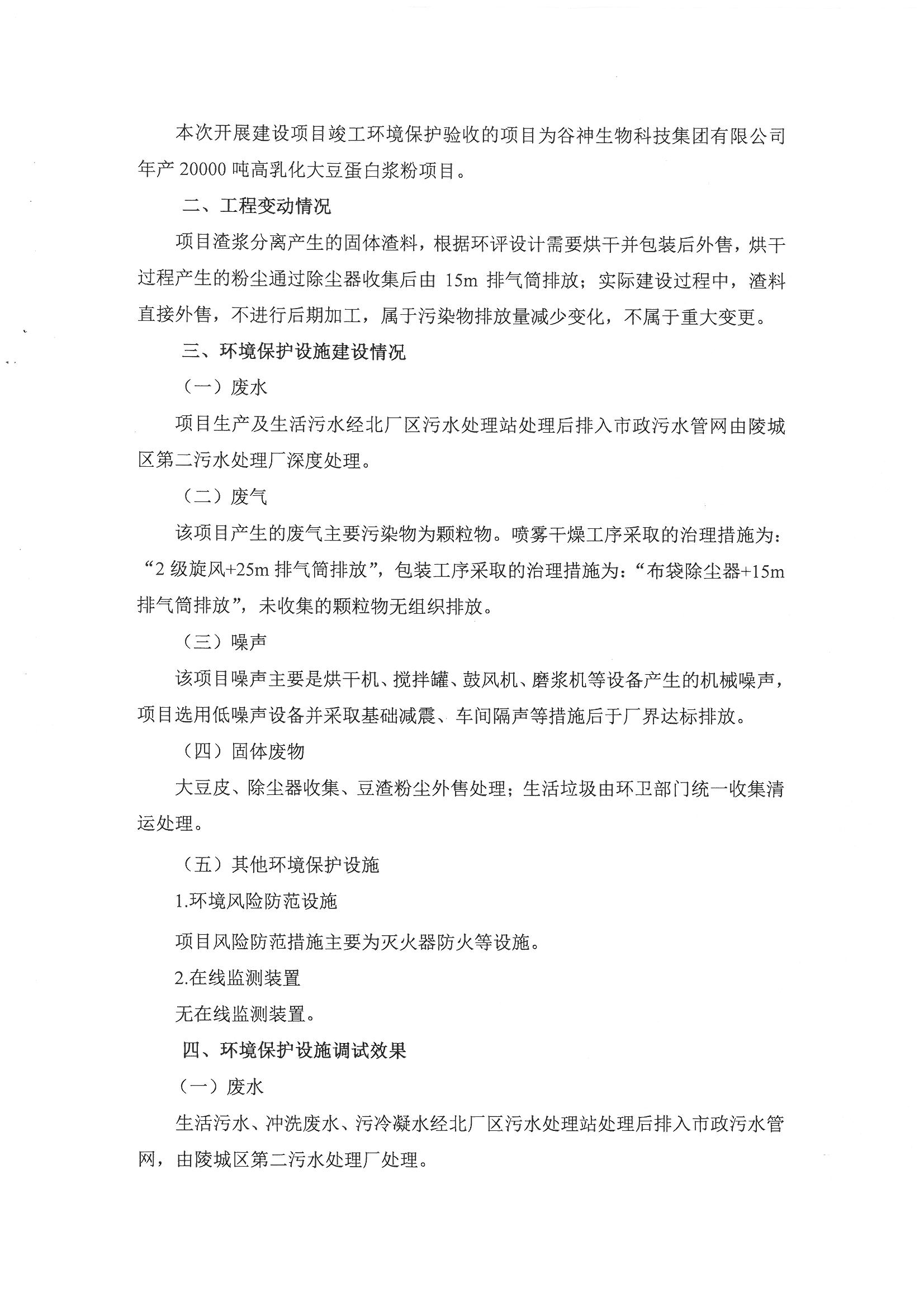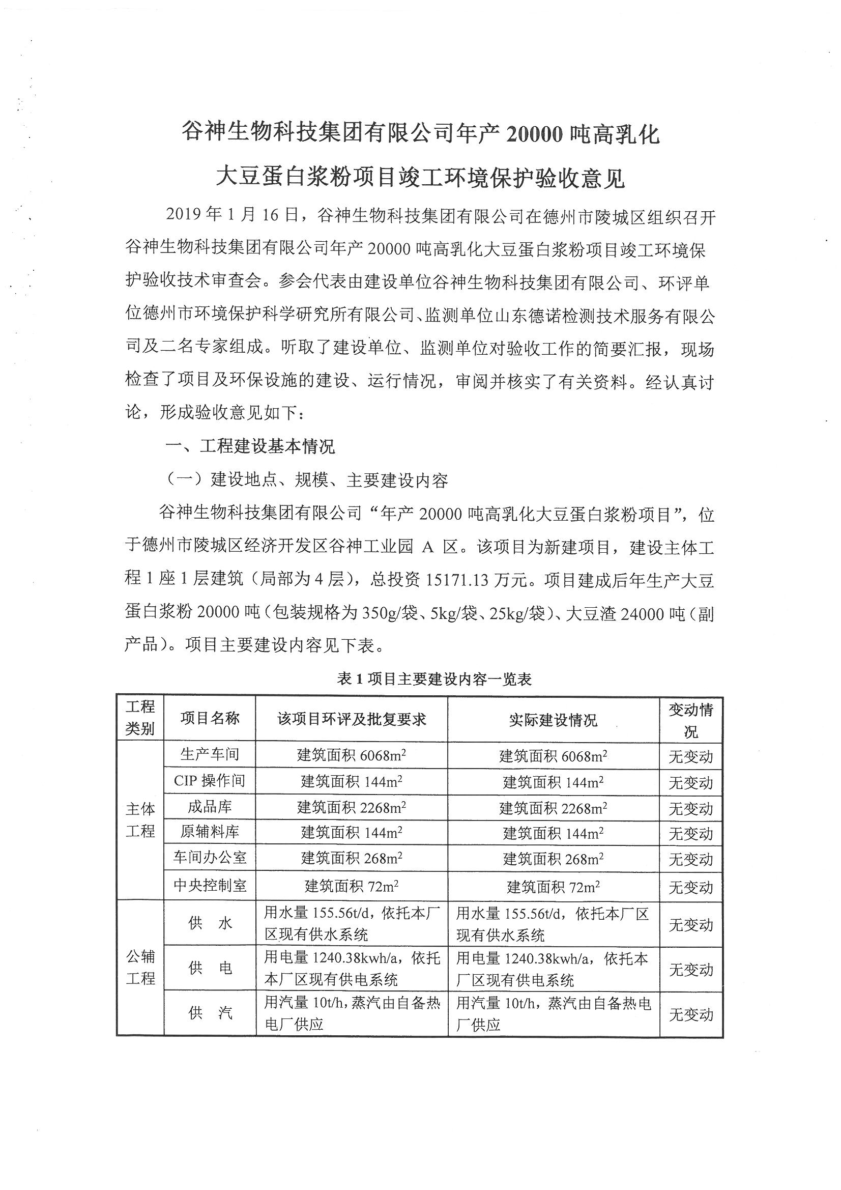 谷神生物科技集團有限公司年產20000噸高乳化大豆蛋白漿粉項目竣工環境保護驗收意見